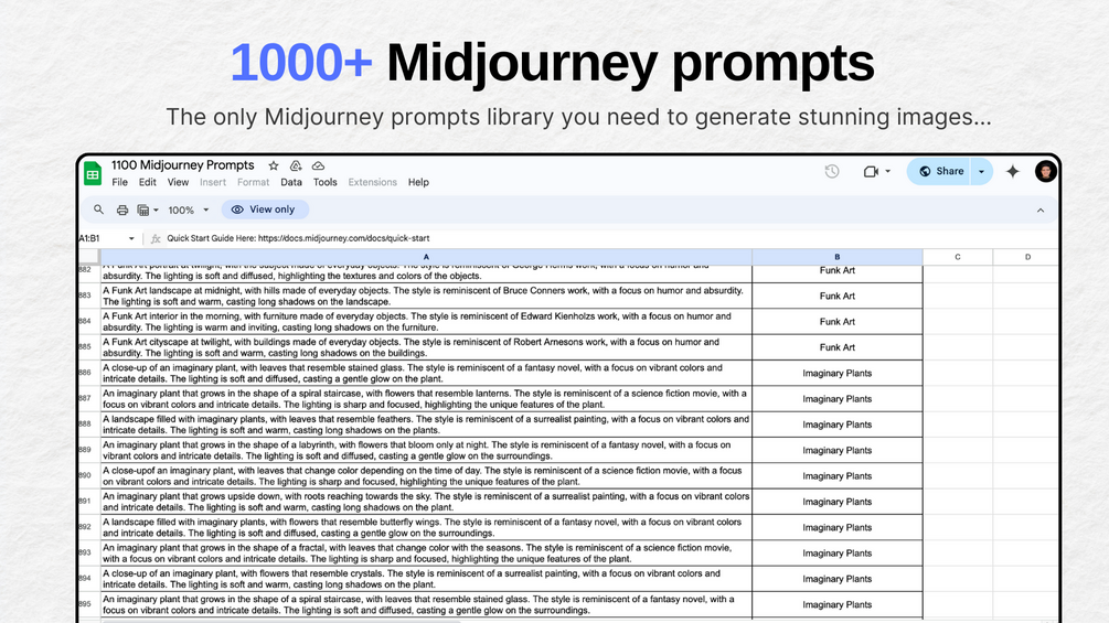 Create stunning, high-quality images with over 1000+ curated Midjourney prompts across every artistic style and theme.